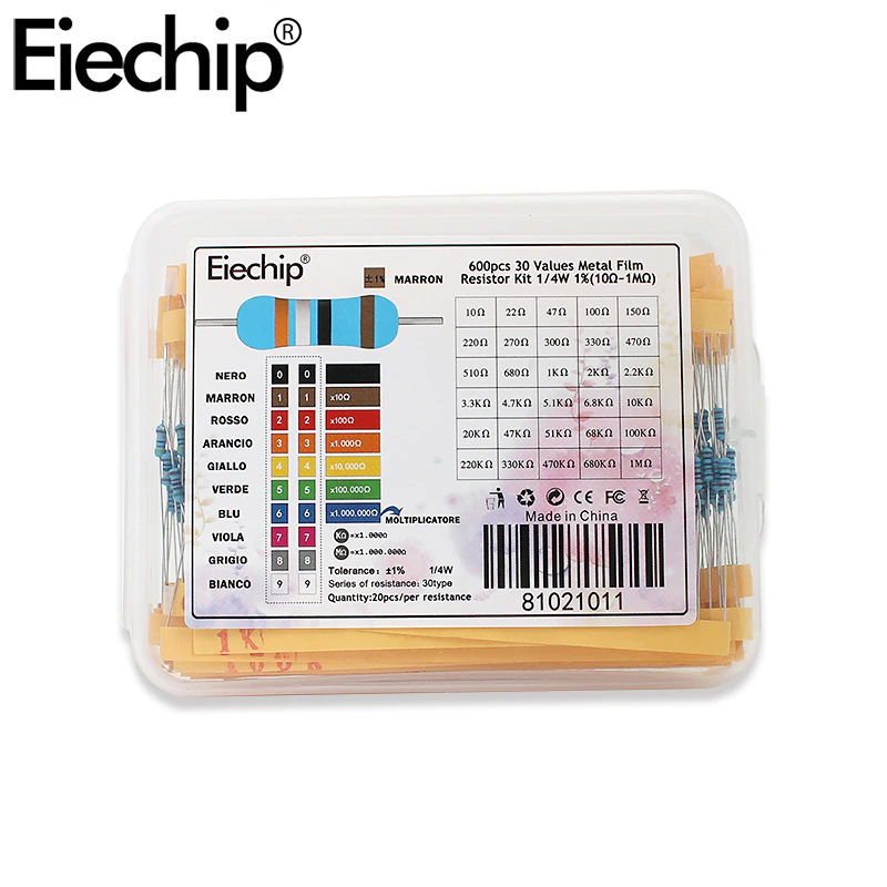 Набор металлических пленочных резисторов 1/4 Вт, 600 шт., 30 значений, набор резисторов пакет резисторов 10R ~ 1M, набор резисторов электронный набор «сделай сам», коробка 1K 10K 100K Ом